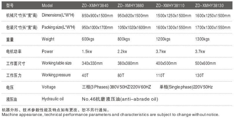 特性: 1.本机分40吨、80吨、110吨、130吨规格(压力)。 2.抽屉式工作台,装有安全装置,操作时安全又方便。 3.本机具有压力大、速度快、压花质量好等优点。 4.上下工作面板均可加热,温度可独立控制,下电热板可按需求进行拆装。